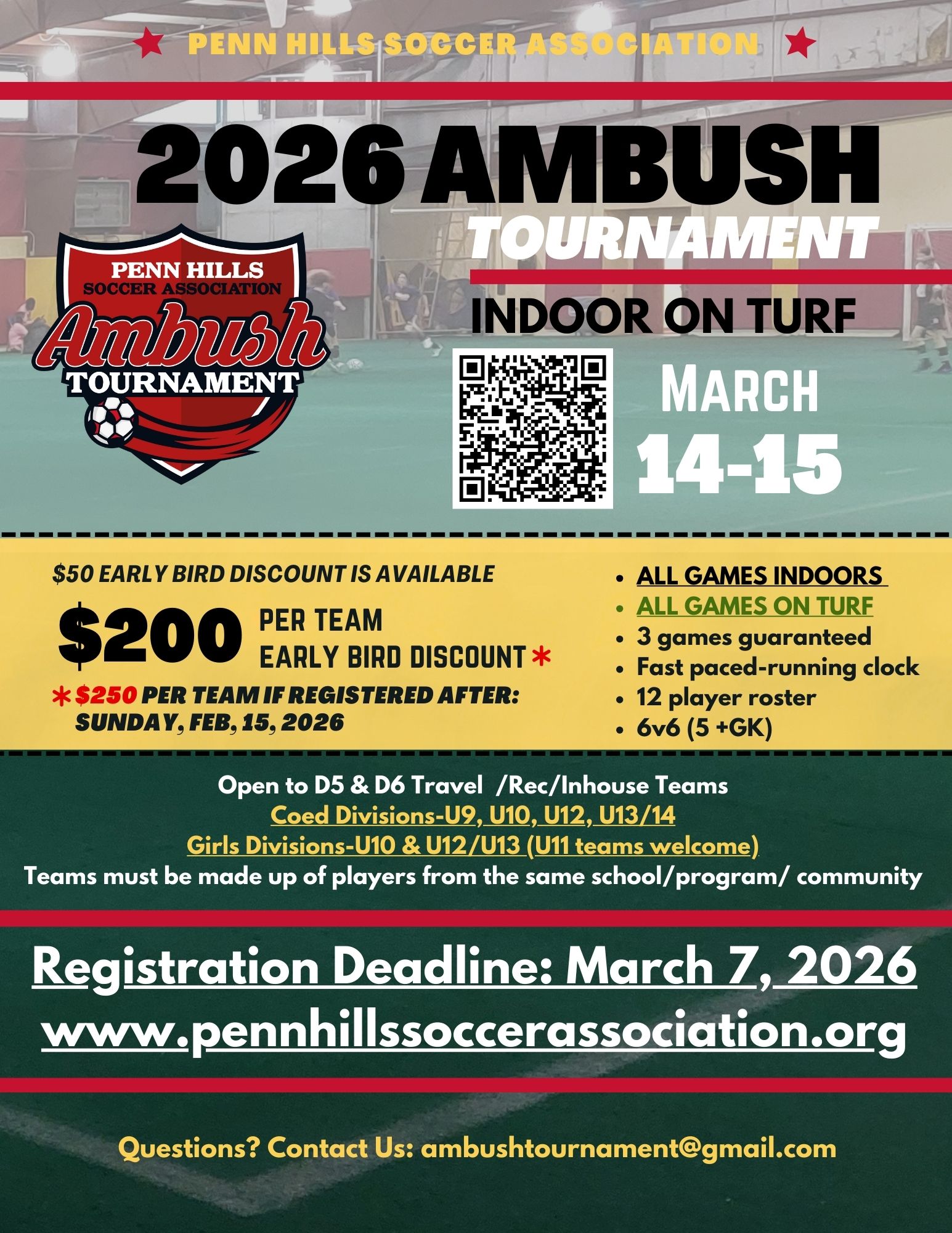 You will receive a confirmation email once your application has been approved for the 2026 PH Ambush Tournament. Please submit your application in step #1. Then immediately send your $250 check in step #2. Parents need to print AND fill out waiver forms #3. Directions to our tournament facility can be downloaded in step #4.